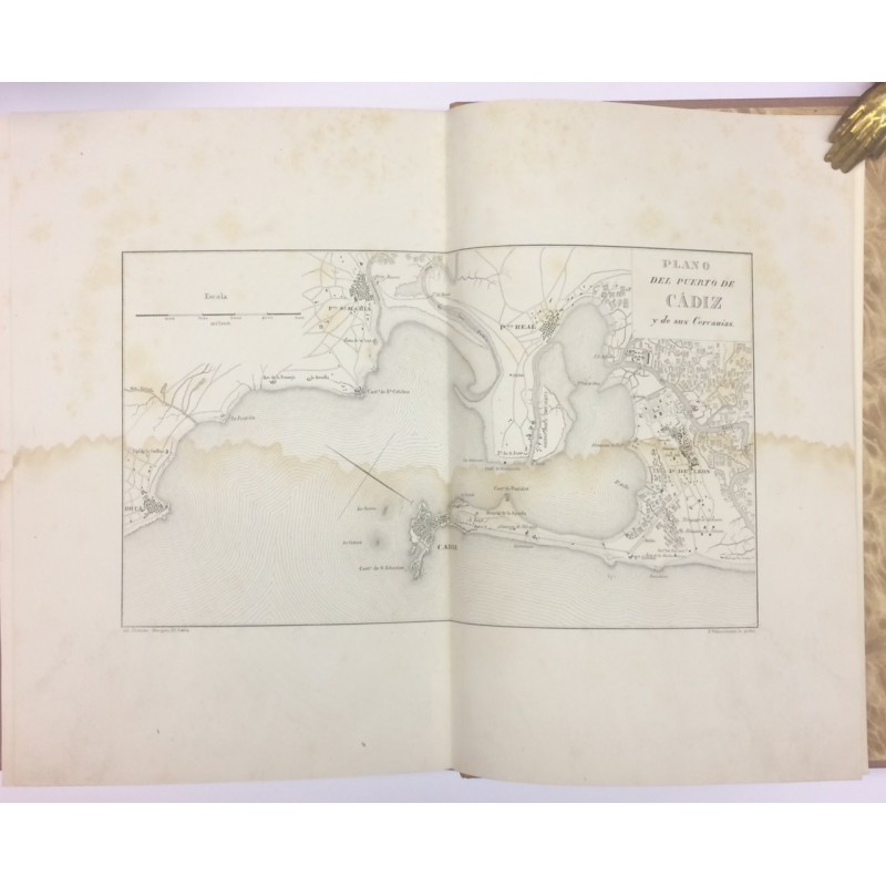 Folio mayor (30 x 21,5 cm). 72 p., [1] h., plano de Cádiz en 1812 a doble hoja (con huella de humedad) y plano del puerto de Cádiz a doble hoja (con huella de humedad). Holandesa moderna. Ejemplar con dedicatoria autógrafa del autor.