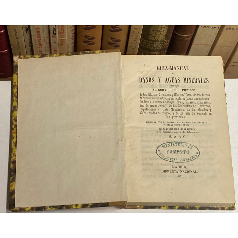 GUÍA-MANUAL de Baños y Aguas minerales destinada al servicio del público; de los Médicas-Directores y Médicos libres, de los dueños de baños y de industriales particulares (como comerciantes, fondistas, dueños de lonjas, cafés, billares, gimnasios, tiro de armas, etc.), de los Secretarios de Gobiernos, Diputaciones y Juntas Sanitarias; de los Alcaldes y Subdelegados del ramo, y de los Jefes de Fomento en las provincias, ampliada con la Legislación de Aguas en general y otras curiosidades, por el Oficial del Ramo de Sanidad S. A. y C.
