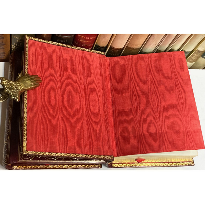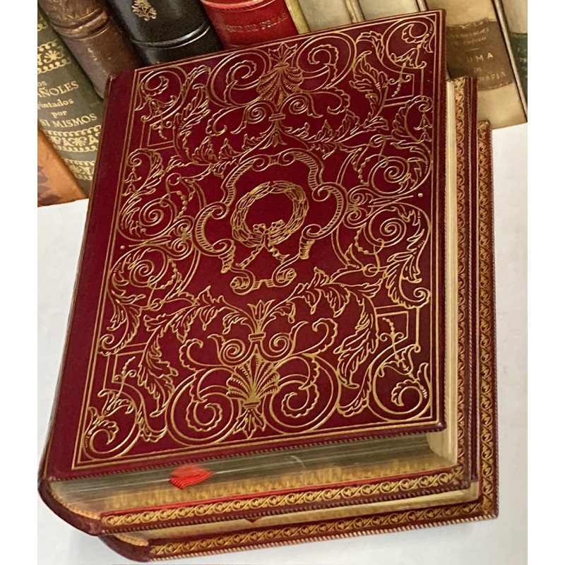 8º mayor (19 x 15 cm). 1 lámina + 1678 p. en papel biblia. ENCUADERNACIÓN EDITORIAL DE LUJO realizada en plena piel de color rojo. Estampación dorada a plancha con motivos vegetales en planos y lomo, éste último cuajado, con autor y título en el compartimento central, ruedas doradas en contracantos (con motivos vegetales), guardas de moaré y cortes dorados.
