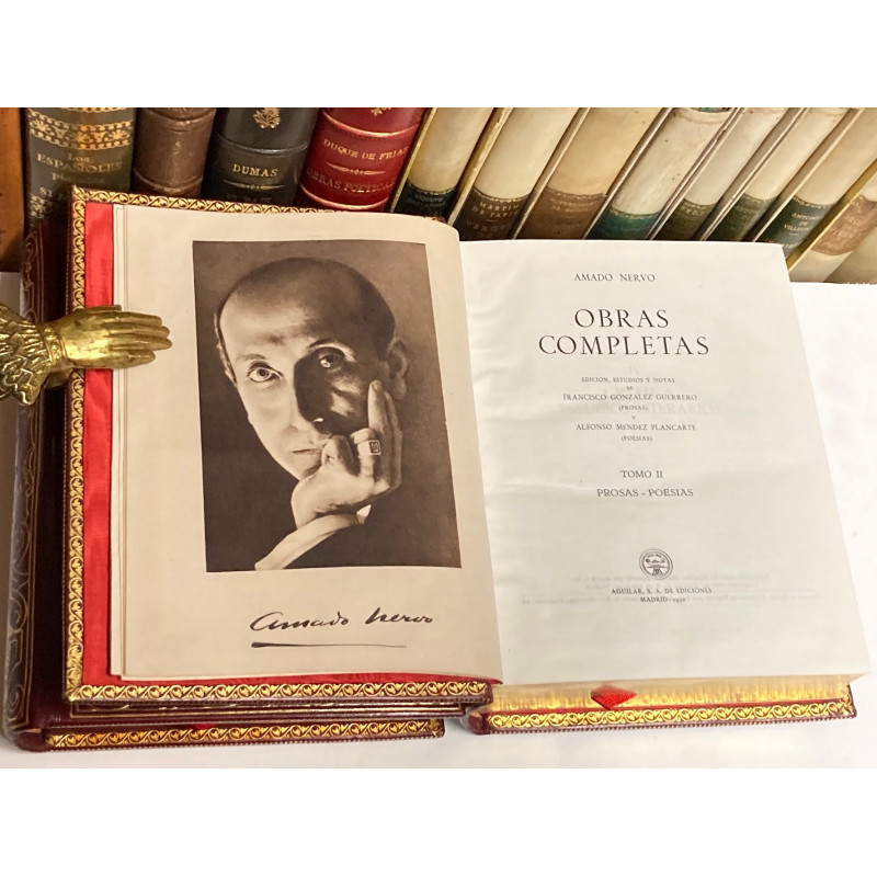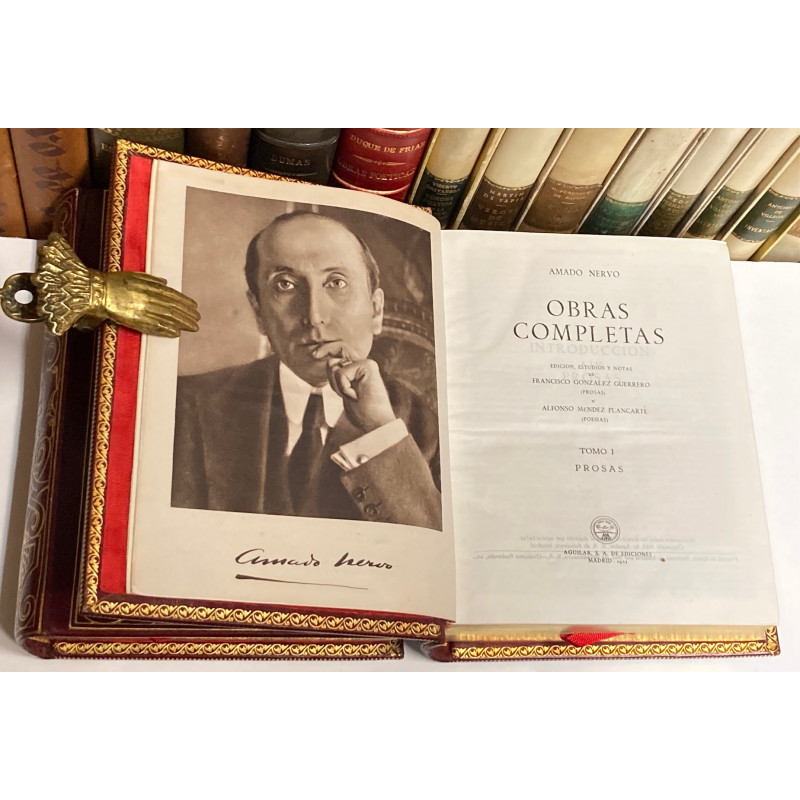 2 vols. 8º mayor (18,5 x 15 cm). TOMO I: Prosas. 1 retrato + 1454p. TOMO II: Prosas-Poesías. 1 retrato + 1889p. Impresión en papel biblia. ENCUADERNACIÓN EDITORIAL DE LUJO realizada en plena piel de color rojo. Estampación dorada a plancha con motivos vegetales en planos y lomo, éste último cuajado, con autor y título en el compartimento central, ruedas doradas en cantos y contracantos (con motivos vegetales), guardas de moaré y cortes dorados.