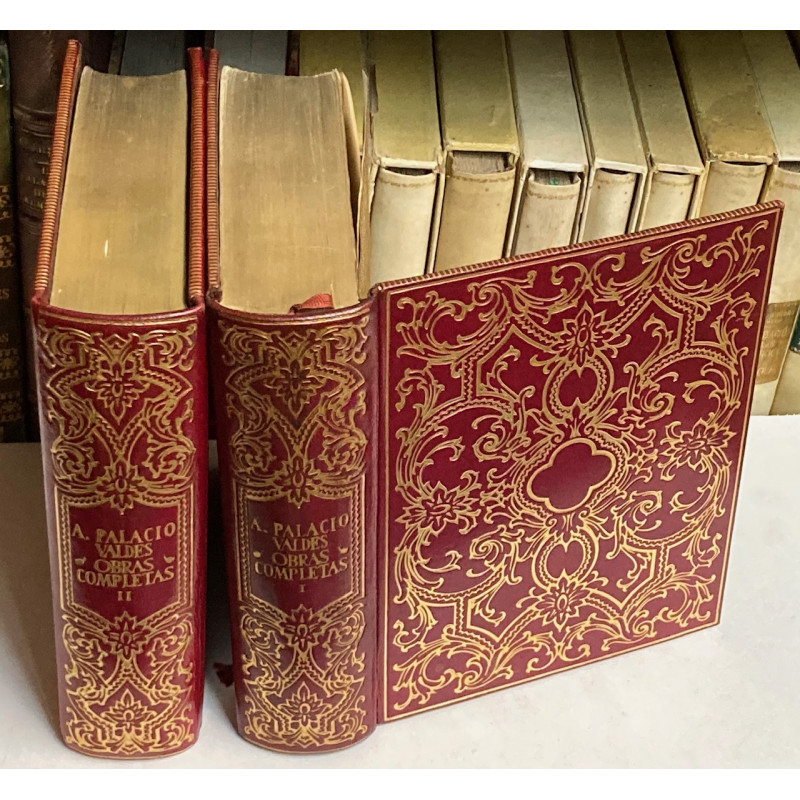 2 vols. 8º mayor (18 x 14 cm). Tomo I: Novelas, Relatos de viajes, Teatro y Poesía. 1 retrato, 1375p y Tomo II: Cuentos. 1retrato, 1600p. Papel biblia. Encuadernación Editorial. Cortes pintados.