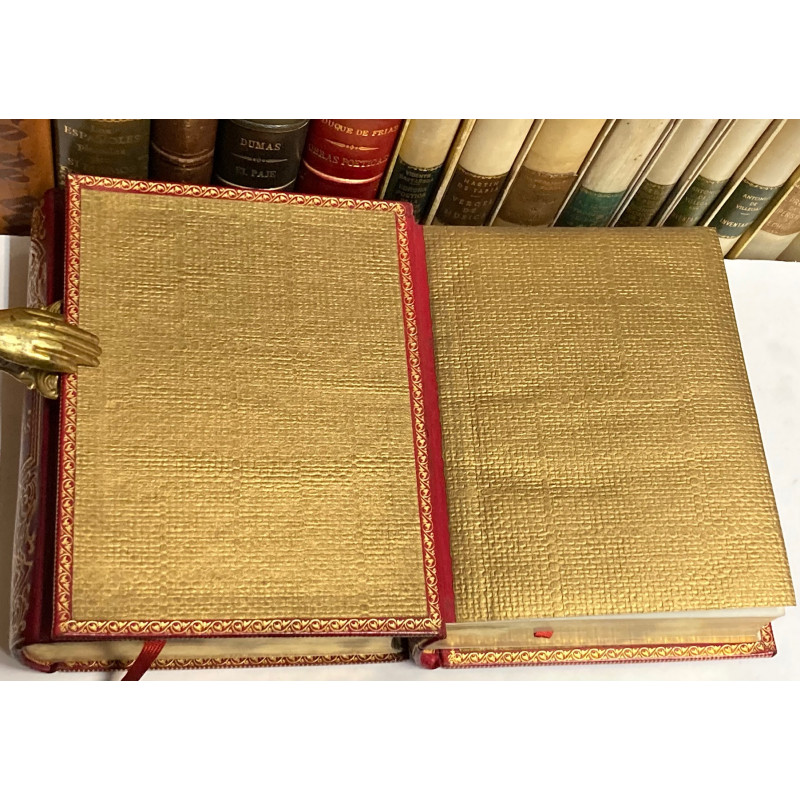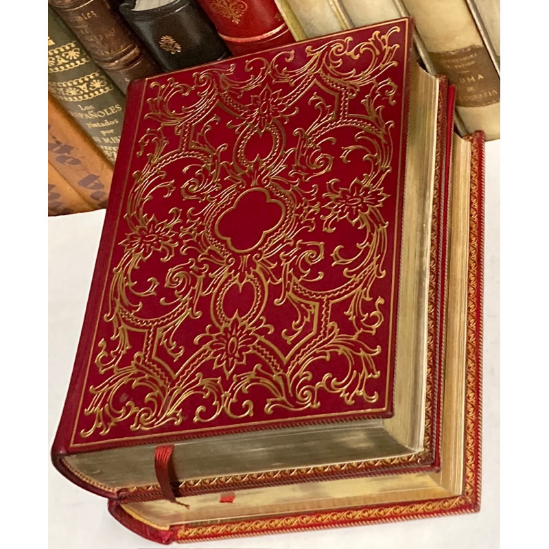 8º mayor (19 x 15 cm). 1 lámina + 1678 p. en papel biblia. ENCUADERNACIÓN EDITORIAL DE LUJO realizada en plena piel de color rojo. Estampación dorada a plancha con motivos vegetales en planos y lomo, éste último cuajado, con autor y título en el compartimento central, ruedas doradas en contracantos (con motivos vegetales), guardas de moaré y cortes dorados.