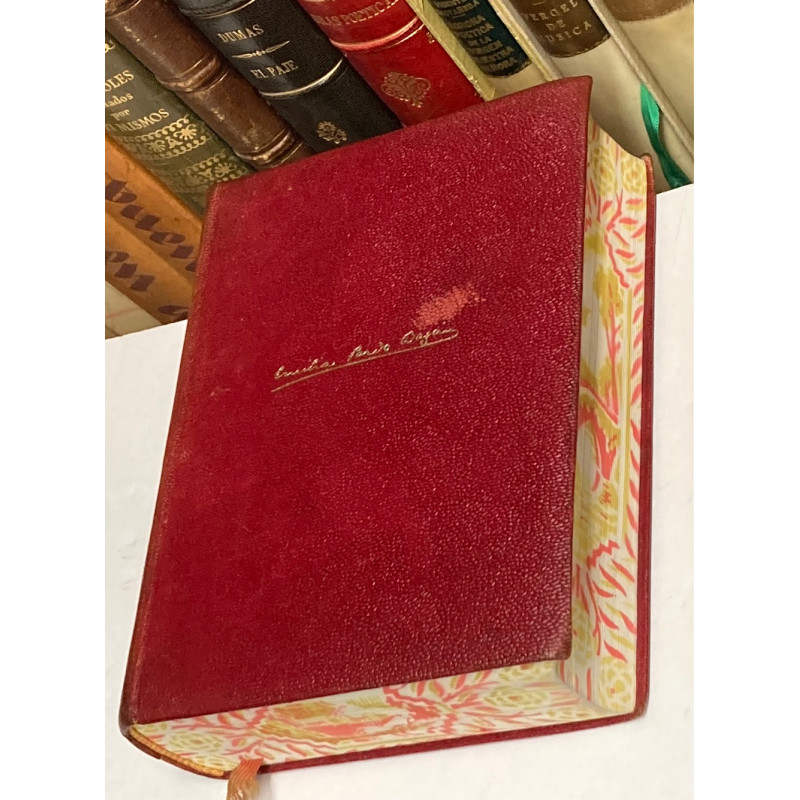 8º mayor (18,5 x 14 cm). 1 retrato, 1922 p. Impresión en papel biblia. ENCUADERNACIÓN EDITORIAL DE LUJO realizada en plena piel. Estampación dorada a plancha con motivos vegetales en planos y lomo, éste último cuajado, con autor y título en el compartimento central, ruedas doradas en cantos y contracantos (con motivos vegetales), guardas de moaré y cortes...