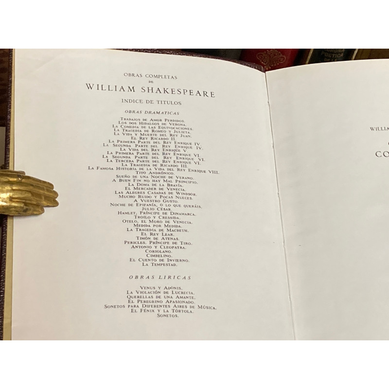 2 vols. 8º mayor (18,5 x 15 cm). TOMO I: Prosas. 1 retrato + 1454p. TOMO II: Prosas-Poesías. 1 retrato + 1889p. Impresión en papel biblia. ENCUADERNACIÓN EDITORIAL DE LUJO realizada en plena piel de color rojo. Estampación dorada a plancha con motivos vegetales en planos y lomo, éste último cuajado, con autor y título en el compartimento central, ruedas...