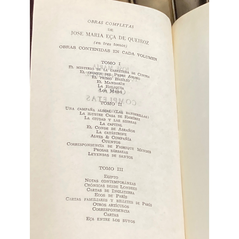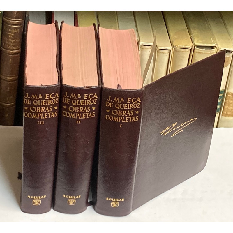 3 vols. 8º mayor (18 x 14,5 cm). TOMO I: NOVELAS, CUENTOS, TEATRO Y POESÍA. 1 retrato + 1524p. TOMO II: CRÍTICA LITERARIA. 1 lámina + 1732p. III: CORRESPONDENCIA, HISTORIA Y POLÍTICA, DISCURSOS. 1 retrato + 1477 p. Papel biblia. Encuadernación Editorial. Cortes pintados. Todos los tomos llevan un sello en la anteportada.
