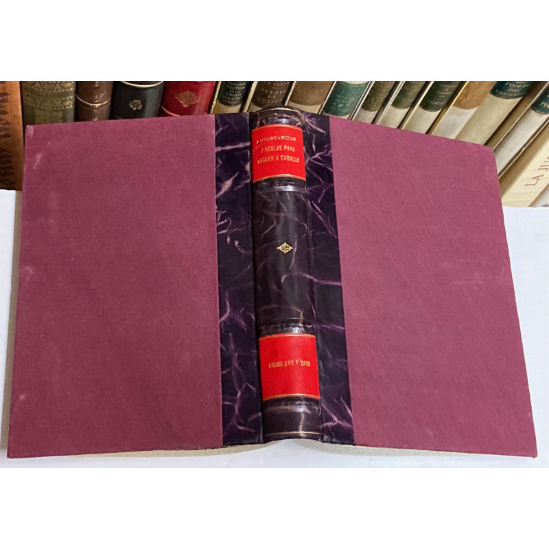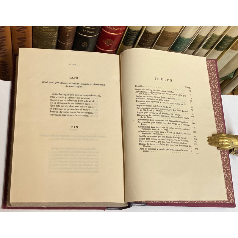 8º mayor. 47 p., [2] h. Holandesa moderna (lomo con hierros dorados alusivos al tema). Conserva cubierta original. ==Este tratado didáctico sobre torear a caballo apareció por primera vez publicado en 1653, en la "Relación de las fiestas eclesiásticas y seculares de la mui noble y siembre leal Ciudad de Córdoba ha hecho a su Ángel Custodio San Rafael este...