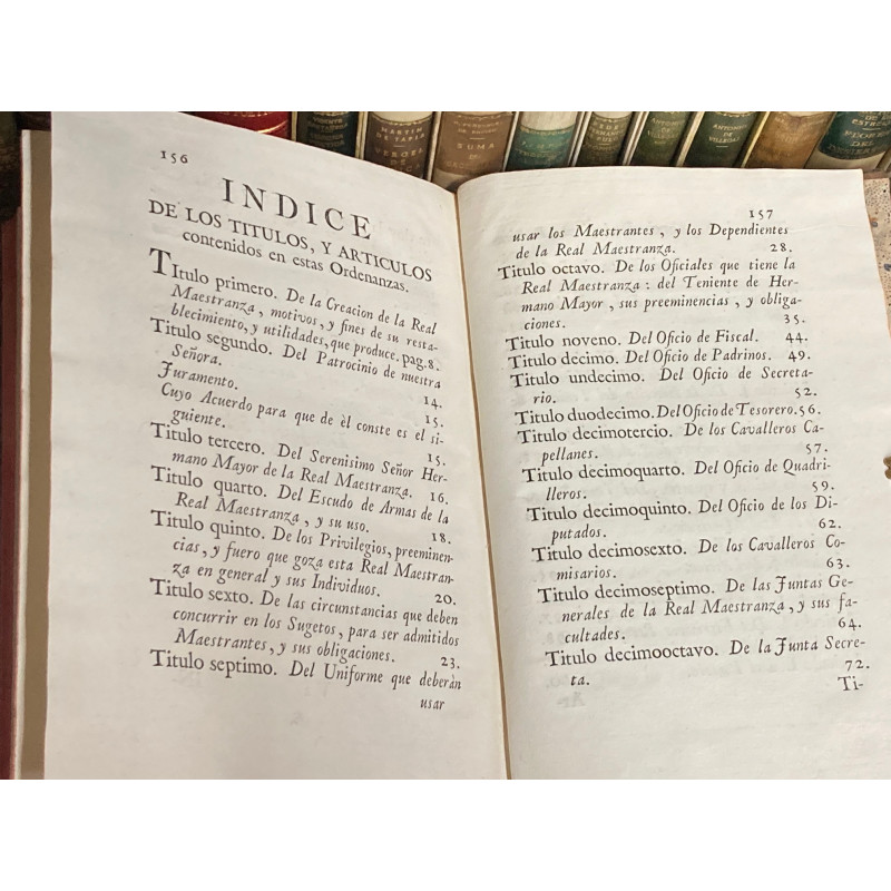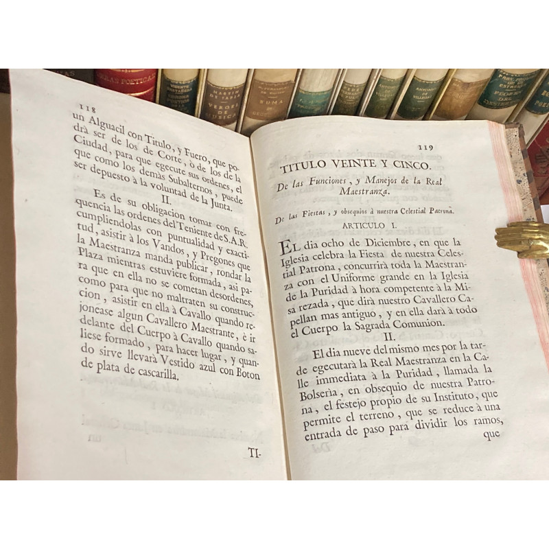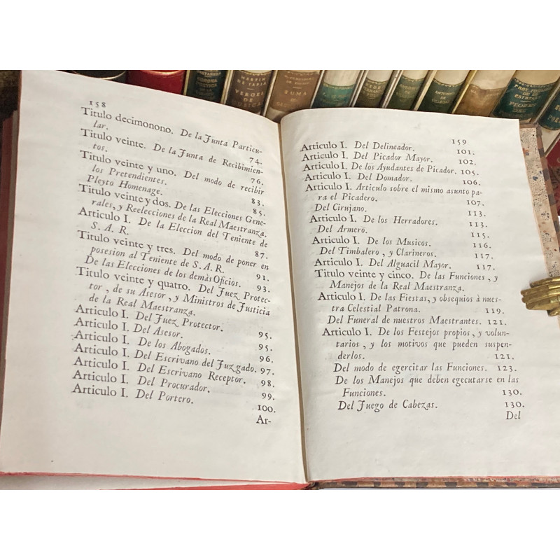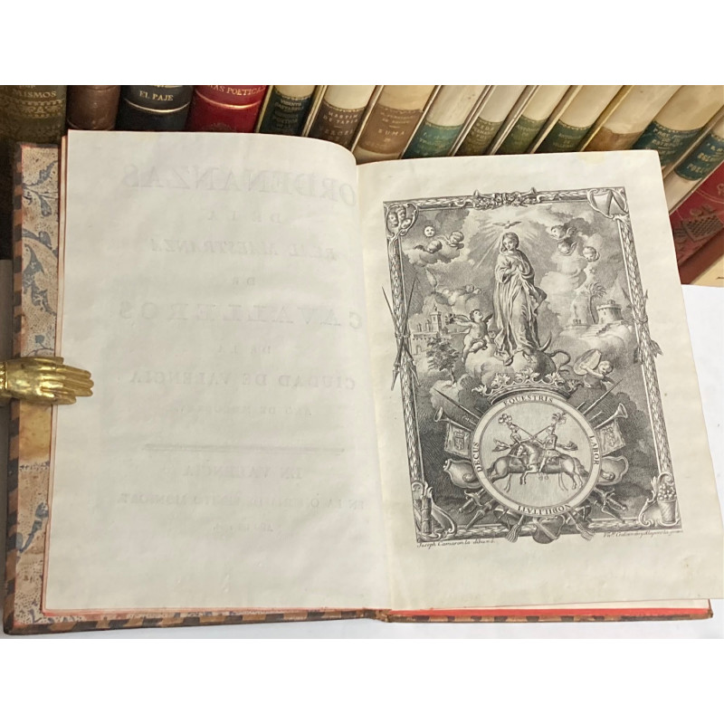 4º mayor (25 x 18 cm). 160 p., con un grabado de la Inmaculada Concepción, dibujado por José Camarón; y el otro, con el escudo de la Maestranza. Impresión en buen papel. Encuadernación en plena piel. Bello papel de aguas utilizado en las guardas.