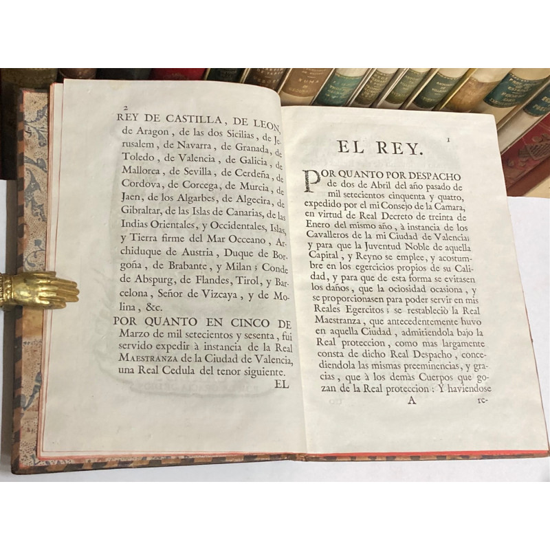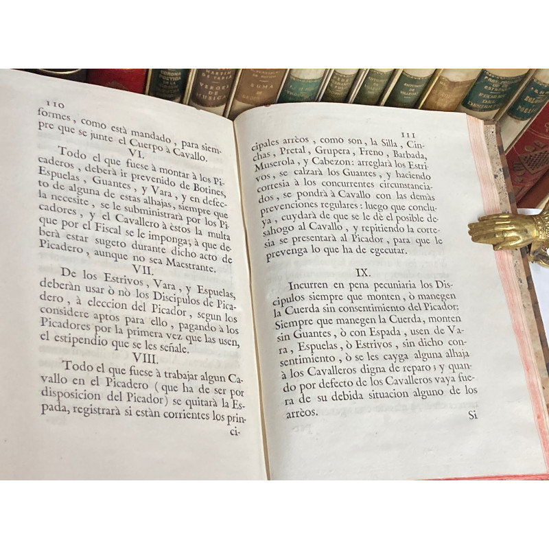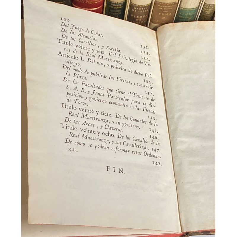 8º mayor. 47 p., [2] h. Holandesa moderna (lomo con hierros dorados alusivos al tema). Conserva cubierta original. ==Este tratado didáctico sobre torear a caballo apareció por primera vez publicado en 1653, en la "Relación de las fiestas eclesiásticas y seculares de la mui noble y siembre leal Ciudad de Córdoba ha hecho a su Ángel Custodio San Rafael este...
